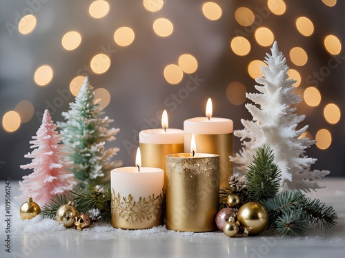 Golden candles with Christmas ornaments and miniature trees on snowy surface. Festive holiday composition with bokeh lights. Christmas decoration and winter holiday concept for design and print