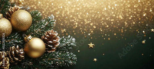 Golden Christmas Ornaments and Pine Cones Decorate a Festive Bough on a Sparkling Background