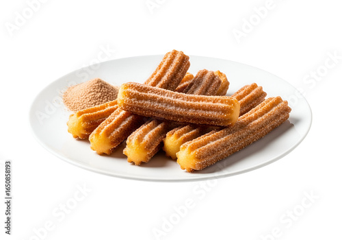Golden churros served with cinnamon sugar on a white plate against a black background