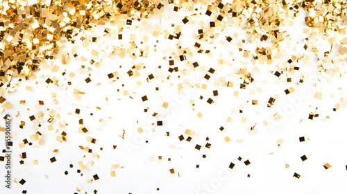 Golden confetti scattered on a white background, ideal for festive or party themes.