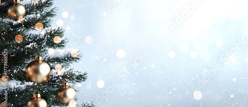 Golden decorations sparkle on a green tree, adding a cheerful touch to the holiday season with a serene blue backdrop and soft lights