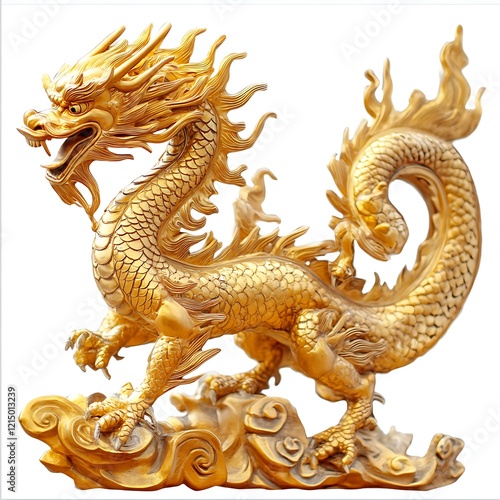 Golden Dragon in Flight: A majestic golden dragon, a symbol of power and good fortune, soars through the clouds, its scales gleaming under the soft light, with a fierce and proud expression.