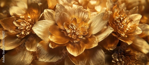 Golden floral elegance in detailed close-up showcasing ornamental flowers with a luxurious metallic sheen and intricate petal textures.