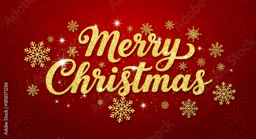 Golden glitter Merry Christmas greeting with elegant script on a rich red backdrop, featuring festive snowflakes, perfect for holiday cards and seasonal joy
