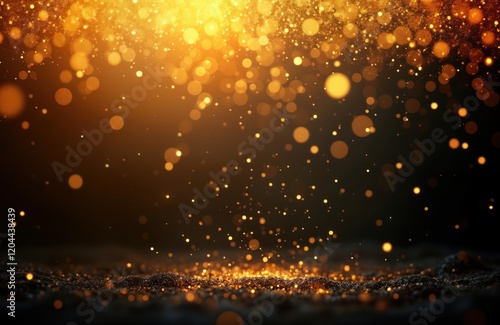 Golden glittering particles splash on dark background. Sparkling particles fall. Abstract texture. Luxurious shine. Elegant design. Futuristic illustration. Magical effect. Dynamic motion. Visual