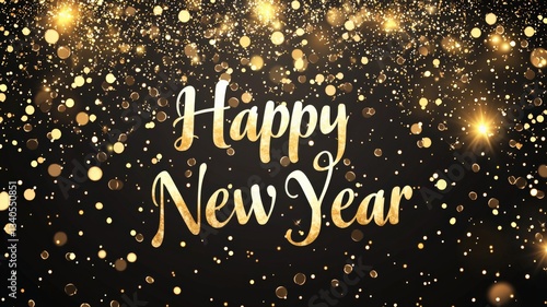 Golden “Happy New Year” text with soft glowing lights on a dark elegant background, festive and luxurious, perfect for New Year greetings, holiday banners, and celebratory designs.