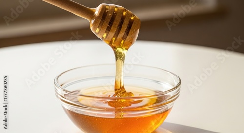 Golden honey dripping from a wooden dipper into a clear glass bowl