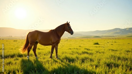 Golden hour equine in a verdant pasture, bathed in the warm glow of the setting sun, a tranquil scene of rural serenity