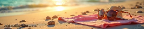 Golden hour sunlight bathes a towel-covered beach scene, perfect for relaxation and summer vibes Seashells and sunglasses add a touch of carefree summer style , nature, seashells, leisure
