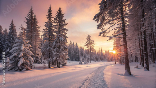 Golden hour sunrise illuminates a snow covered forest path lined with fir trees