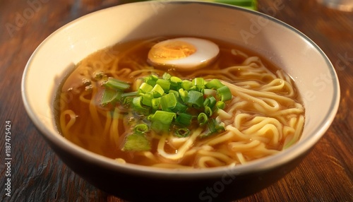 Golden Hours Capture of a Hearty Bowl of Ramen with Floating Scallions
