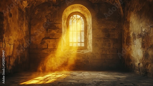 Golden light streams through an arched window in an old stone room, illuminating dust motes in the air.