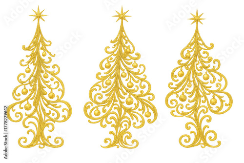 Golden ornate christmas trees featuring elegant arabesque scrollwork and holiday ornaments, on transparent background