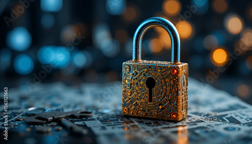 Golden padlock with intricate circuit design rests on a motherboard, symbolizing digital security and data protection with blue and orange bokeh.
