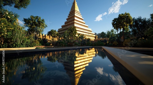 Golden pagoda reflection serene water body architectural marvel lush nature wide angle view spiritual tranquility