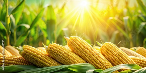 Golden Ripe Corn Cobs in a Lush Green Field Bathed in Sunlight