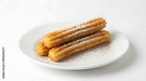 Golden Spanish Churros Dusted with Powdered Sugar and Cinnamon Served on a White Plate. Traditional Fried Pastry Dessert Studio Shot.