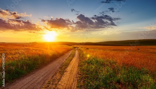 Golden Sunset Over Dirt Road Through Grassy Open Field