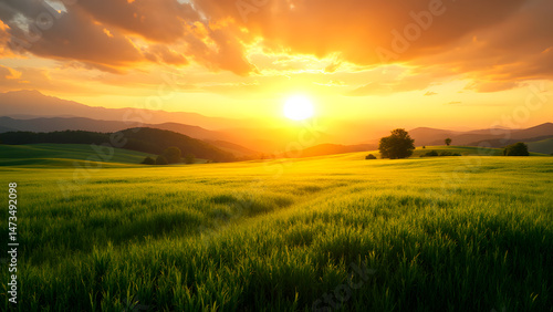 Golden Sunset over Fields: The sun casts a radiant glow over a vast expanse of vibrant green fields, with a silhouette of a tree. The landscape is bathed in the warm light.