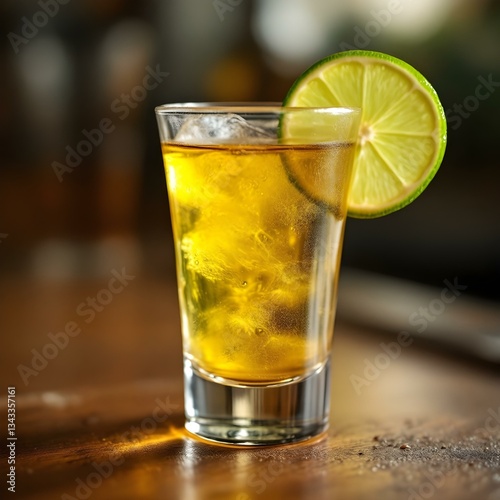 Golden Tequila Shot with Lime Garnish on Wood