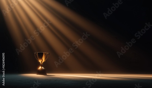 Golden trophy illuminated by dramatic light beams in empty dim room, symbolizing victory and success in competition or business achievement