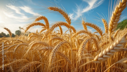 Golden wheat field under a bright sky with clouds, sunlight shining. Agriculture and harvest, concept. Farming and crop growth. The concept of agriculture and sustainable farming.