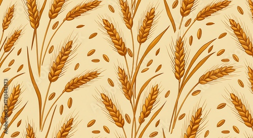 Golden Wheat Stalks and Grains Seamless Pattern Background.
