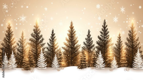 Golden winter forest, snowy landscape, falling snowflakes, holiday background
