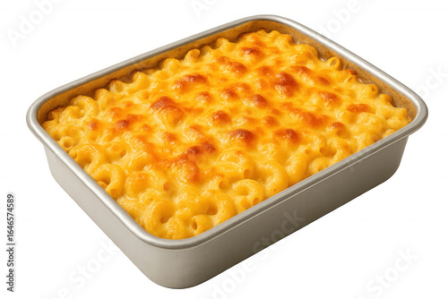 Golden-brown mac and cheese gratin steaming in metallic tray, melted cheese bubbling, crisp surface gleaming against neutral backdrop