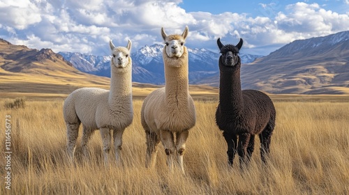 Golden-yellow grass stretches under a vibrant blue sky dotted with fluffy white clouds. A majestic mountain range looms softly behind, bathed in sunlight that dances through drifting clouds