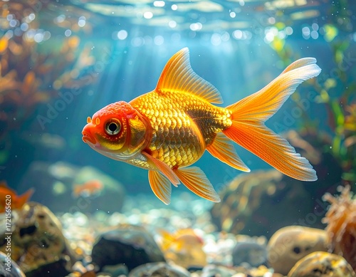 Goldfisch schwimmt ruhig im klaren Aquarium.