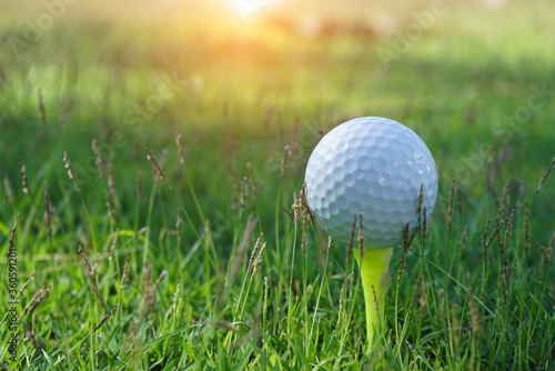 Golf ball on tee in the evening golf course with sunshine background