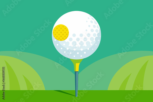 Golf ball on tee with green landscape background