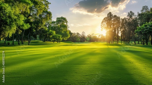 Golf fairway landscape with vibrant green grass and tall trees under a bright sky