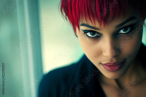 Gorgeous smiling black girl - for ads, banner and online marketing networks use. Commercial promotion visual idea. Short trim - red hair. Black model campaign. Black girl style. Black girl ad.