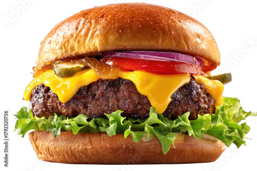 Gourmet Cheeseburger with Melted Cheddar and Fresh Toppings on Isolated Background