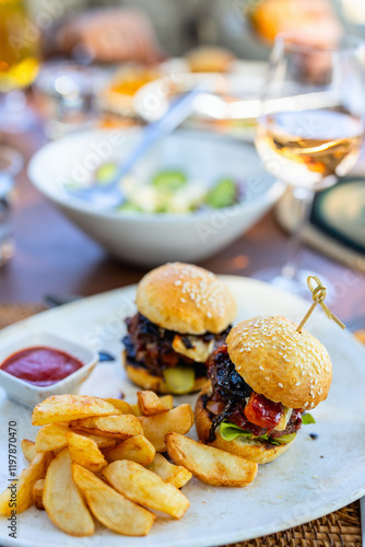 Gourmet sliders with fries and wine.