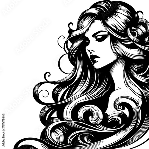 Graceful Beauty Illustration: An elegant black and white illustration portrays a woman with long, flowing hair. The intricate details capture the essence of beauty, art, and style.