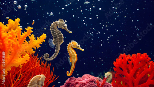Graceful seahorses drifting among vibrant coral reefs create mesmerizing underwater scene filled with bubbles and colorful marine life