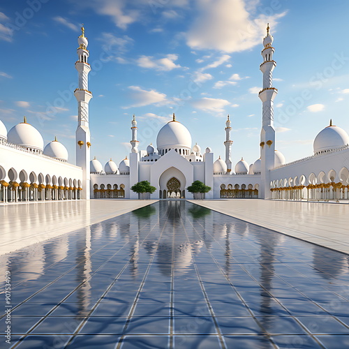 Grand Mosque Abu Dhabi, Architectural Illustration of a Mosque with Domes and Minarets