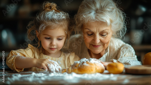 Grandmother and Granddaughter Baking Together in a Cozy Kitchen, Flour Dusting the Air, Creating Warm Family Moments, Generational Bonding Through Baking, Joyful Kitchen Activity, Childhood Memories
