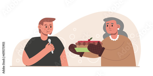 Grandmother cooked cake for grandson. Concept of happy retirement. Time for seniors hobbies. Positive seniors spending time indoors. Vector flat illustration in brown colors