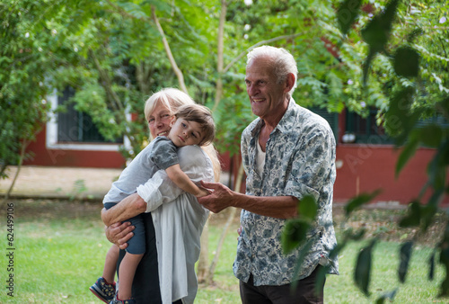 Grandmother with grandson on her arms and grandfather grabbing the toddler's hand smiling outdoors