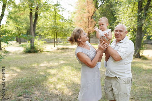 grandparents and baby grandchild walking in nature park, copy space