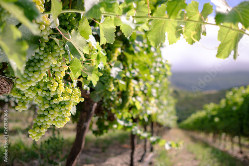 Grapevine loaded with bunches of white wine grapes in vineyard