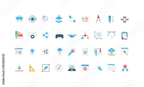 Graphic and web design, tools and options, designer and author equipment, software settings color icon set. Work with layers and draft, UI UX ideas and portfolio, calendar flat vector illustration