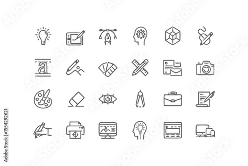 Graphic Design Icon Set: A comprehensive collection of minimalist line icons representing various graphic design tools, concepts, and processes.