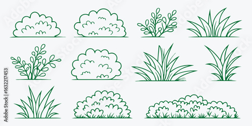 Grass and Bush Line Art Vector Icon Set. Green Hand Drawn Doodle of Nature, Plants, and Garden Elements. Simple Outline Illustration for Landscape Design, Park, and Lawn Graphics.