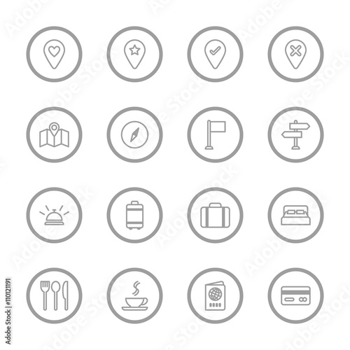 gray line travel icon set with circle frame for web design, user interface (UI), infographic and mobile application (apps)