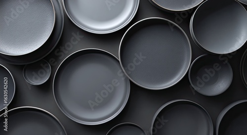 Gray plates and bowls arranged in a circular pattern